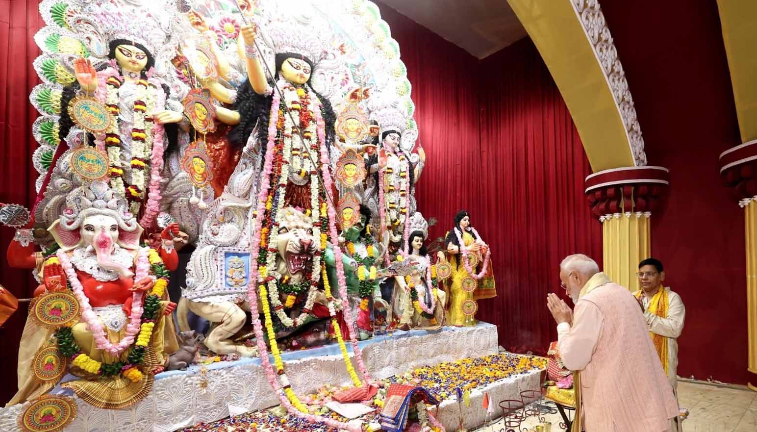 नई दिल्ली, 1 अक्टूबर 2025 — अष्टमी के पावन अवसर पर प्रधानमंत्री नरेंद्र मोदी ने मंगलवार को दक्षिण दिल्ली स्थित चित्तरंजन पार्क (सीआर पार्क) में दुर्गा पूजा पंडाल और काली बाड़ी मंदिर में मां दुर्गा और मां काली के दर्शन किए। इस दौरान उन्होंने आरती की, पूजा-अर्चना की और माथे पर तिलक लगाया। प्रधानमंत्री के साथ बड़ी संख्या में श्रद्धालुओं ने भी देवी के दर्शन किए।