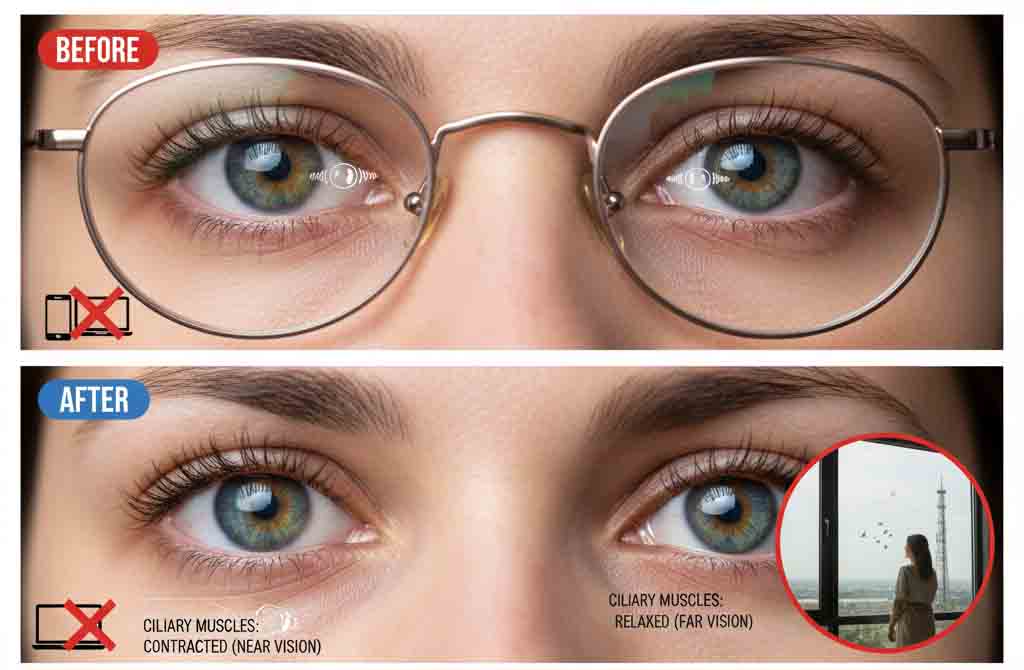 क्यों कमजोर हो रही हैं आंखें? आंखों की कार्यप्रणाली को समझने के लिए हमारी सिलियरी मसल्स (Ciliary Muscles) की भूमिका महत्वपूर्ण है। ये मांसपेशियां जब सिकुड़ती (Contract) हैं, तो हम पास का देख पाते हैं और जब ये रिलैक्स होती हैं, तो हम दूर का देख पाते हैं। आजकल मोबाइल, लैपटॉप और बंद कमरों में काम करने के कारण हमारी आंखें दिन भर केवल ‘पास की नजर’ पर काम करती हैं। इससे मसल्स का लगातार कंट्रक्शन होता रहता है और उन्हें रिलैक्स होने का मौका नहीं मिलता, जिससे मांसपेशियों में एट्रोफी (Atrophy) होने लगती है।